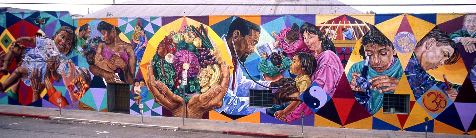 This mural was commissioned by SPARC as part of their Neighborhood Pride Mural Program. The theme of the mural combines images of community and healthcare. It was painted with the assistance of community volunteers and paid youth.